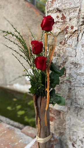 3 roses amb gerro d´escorça natural