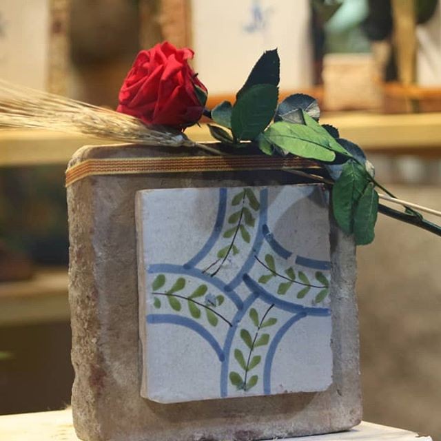 Rajola de tova amb ceràmica del segle XIX, i rosa preservada
